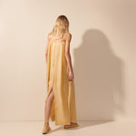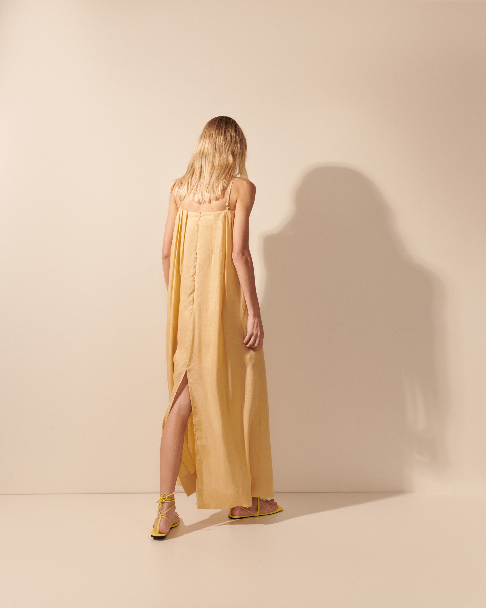 Vestido midi em linho com decote coração e pregas frontais que criam volume sutil e movimento elegante. A fluidez da modelagem e o toque natural do tecido revelam o equilíbrio entre leveza e sofisticação. É a peça perfeita para ocasiões que pedem presença e delicadeza.