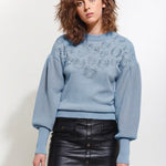 Com modelagem ampla e gola careca em ponto canelado, a blusa em tricot ganha sofisticação através dos bordados manuais, que desenham flores orgânicas na parte frontal da peça. O design se destaca ainda pelos ombros caídos e mangas bufantes, que adicionam volume e presença ao look — finalizadas por punhos ajustados que equilibram a silhueta. O ponto texturizado das mangas cria contraste visual e tato rico, valorizando o acabamento artesanal. Uma peça que traduz elegância contemporânea com delicadeza e personalidade.