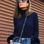 Com elegância atemporal e toque contemporâneo, a blusa de gola roulê ganha um novo protagonismo com os punhos em pele natural — um detalhe marcante que transforma a peça em um verdadeiro ícone de estilo. Confeccionada em tricot de viscose com poliamida, tem textura macia, caimento ajustado e alto nível de conforto.