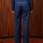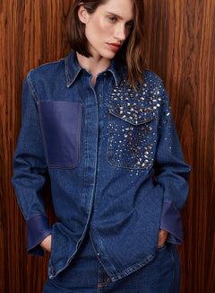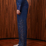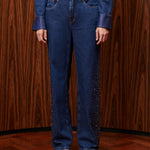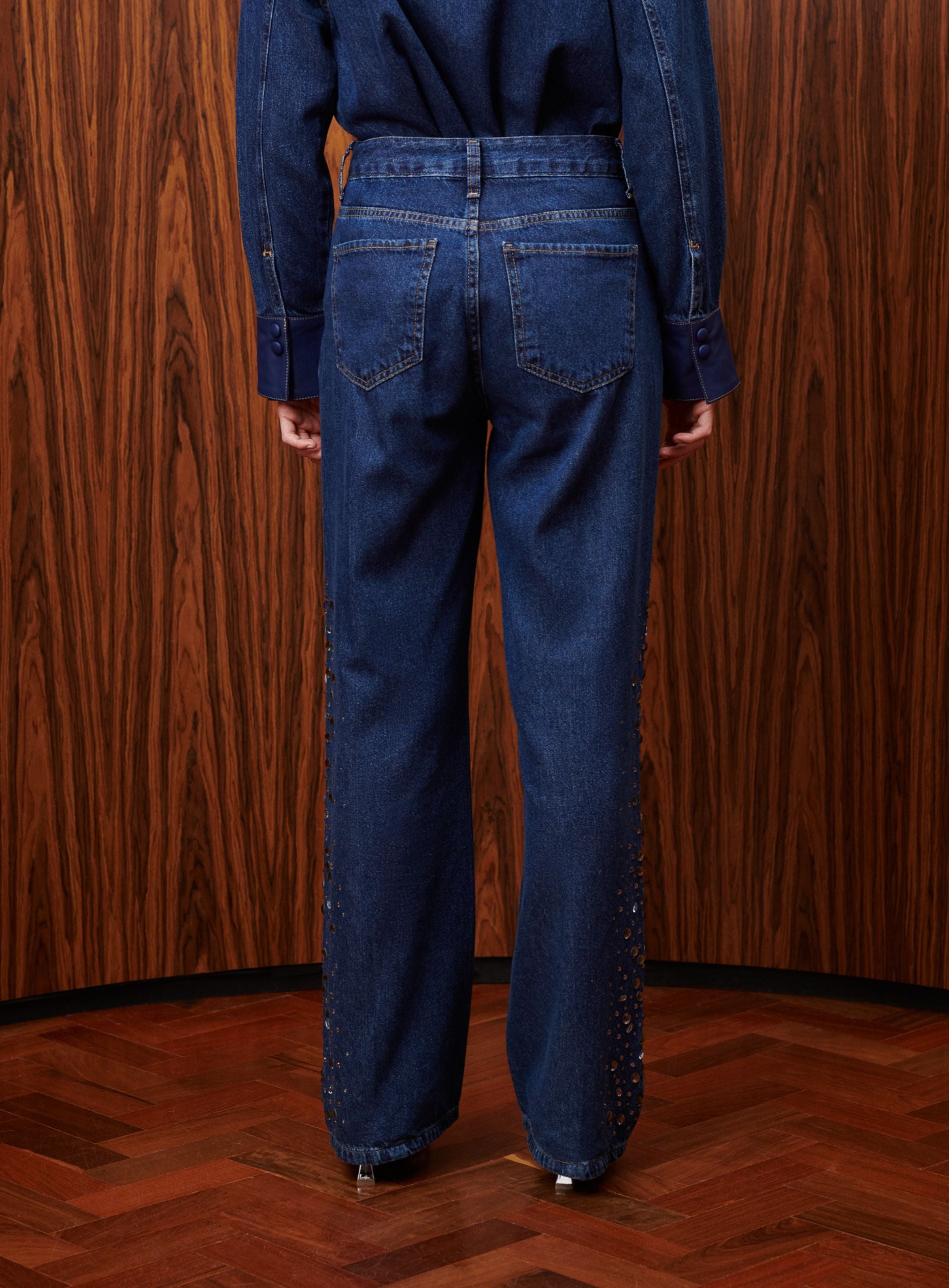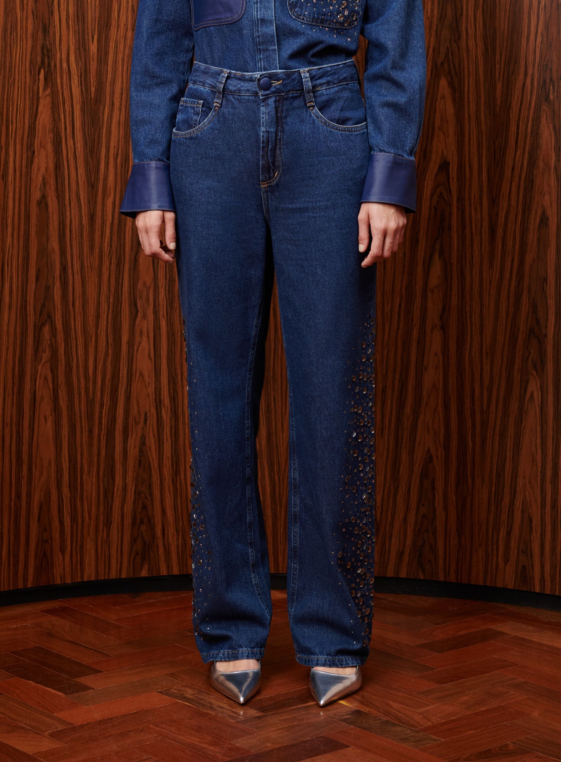 Calça confeccionada em jeans. Modelagem ampla e shape solto. Possui aplicação de strass e bolsos frente e costas. Cós com passantes para cinto, braguilha com zíper e botão em couro.