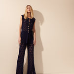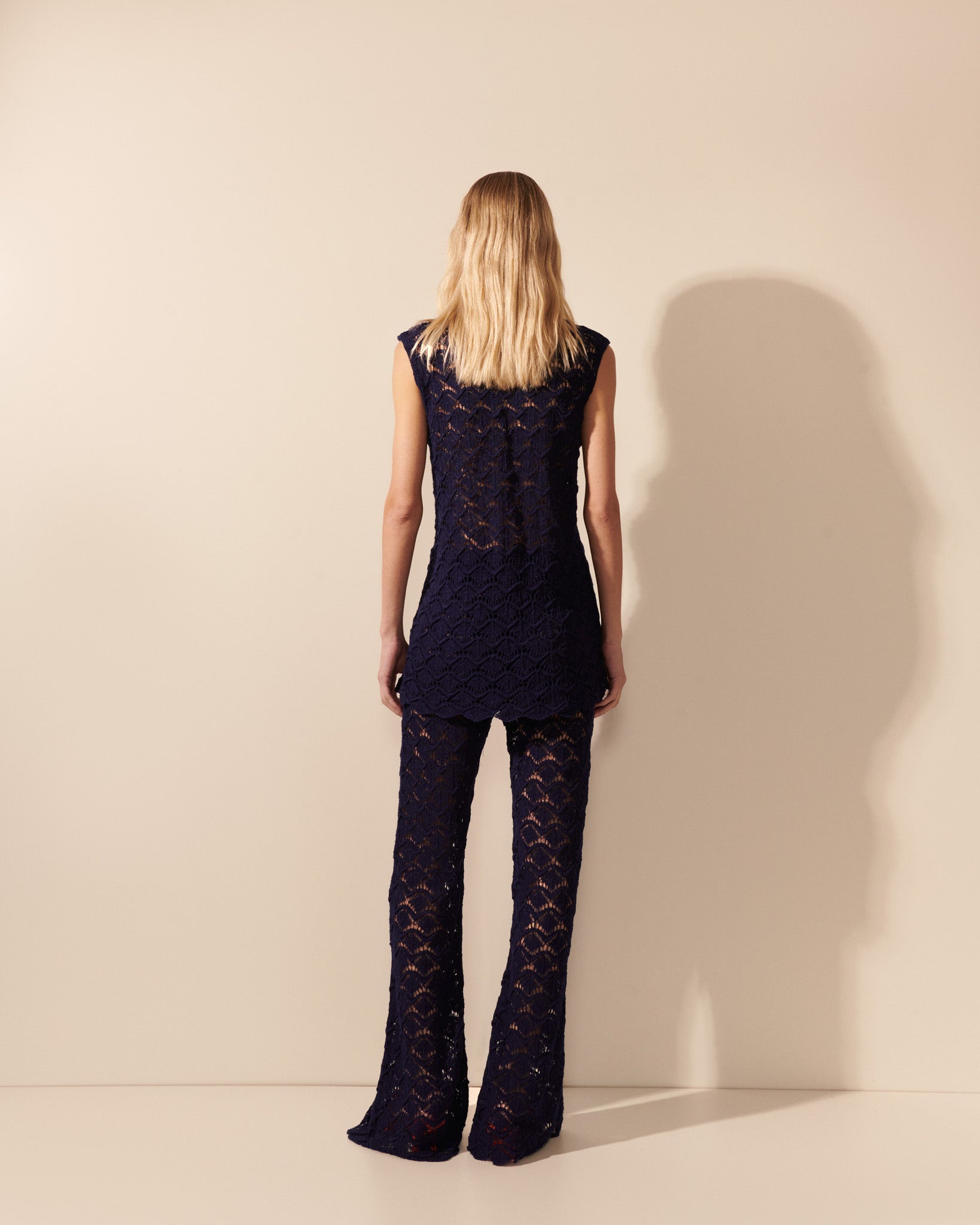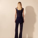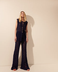 Calça confeccionada em renda de tricô, com trama rendada elaborada que mistura fios de viscose e poliamida para garantir leveza, conforto e sofisticação. A modelagem é ajustada na parte superior e se abre a partir do joelho, criando uma silhueta alongada e elegante com boca levemente flare. O comprimento é alongado, tocando o peito do pé com fluidez, o que valoriza o movimento e reforça o aspecto etéreo da peça. A transparência da renda cria um jogo sutil de revelação, tornando a calça perfeita para composições em sobreposição ou em conjuntos coordenados.
