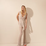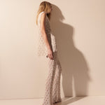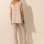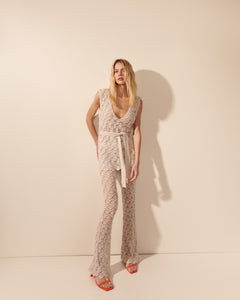 Calça confeccionada em renda de tricô, com trama rendada elaborada que mistura fios de viscose e poliamida para garantir leveza, conforto e sofisticação. A modelagem é ajustada na parte superior e se abre a partir do joelho, criando uma silhueta alongada e elegante com boca levemente flare. O comprimento é alongado, tocando o peito do pé com fluidez, o que valoriza o movimento e reforça o aspecto etéreo da peça. A transparência da renda cria um jogo sutil de revelação, tornando a calça perfeita para composições em sobreposição ou em conjuntos coordenados.