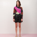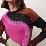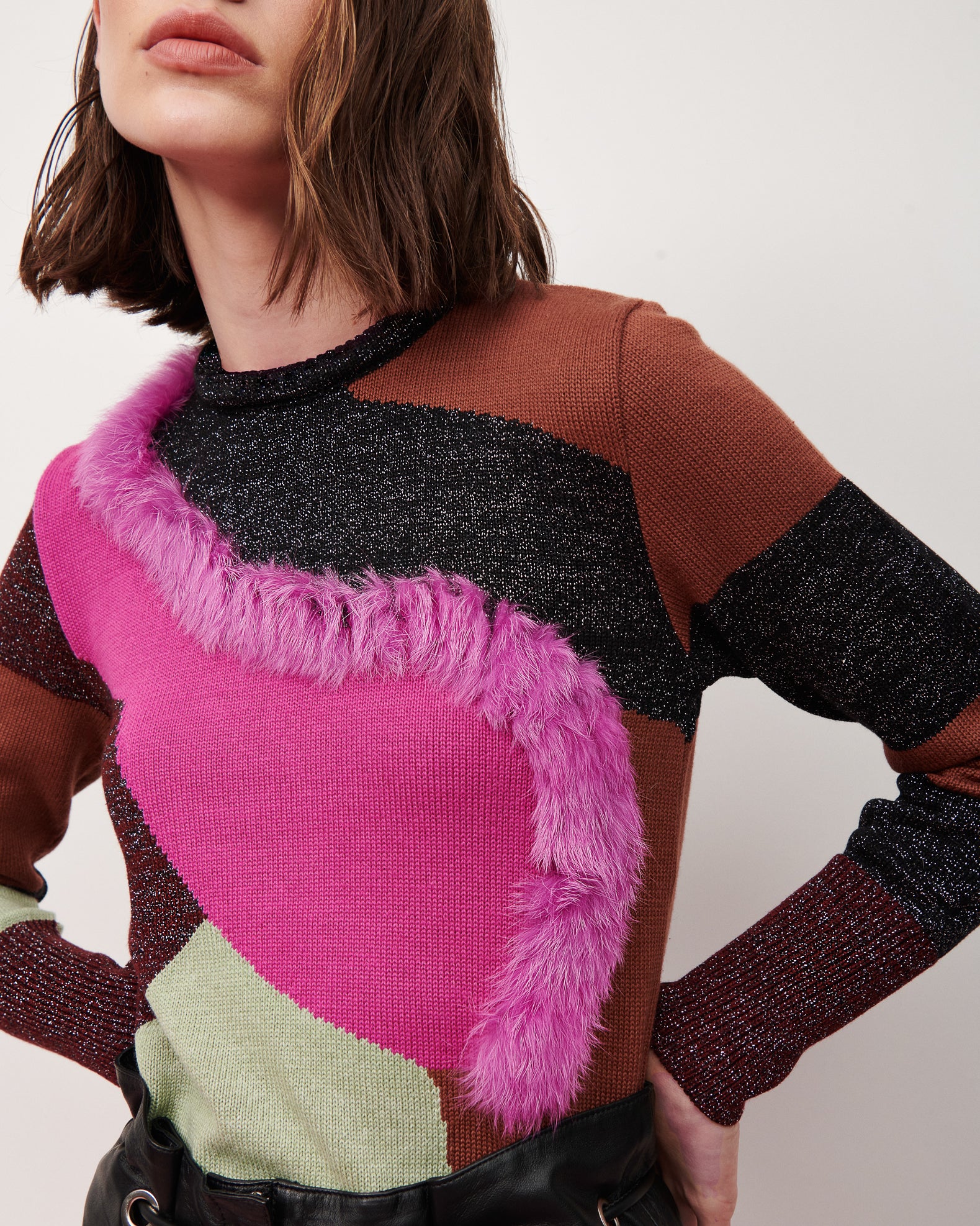 A blusa tricot gola careca intarsia orquídea traz um visual moderno e cheio de personalidade. Confeccionada em tricô macio, possui toque confortável e caimento estruturado. O destaque fica por conta do desenho em intarsia com mistura de cores vibrantes incluindo rosa orquídea, preto, marrom e verde criando um contraste artístico e contemporâneo.