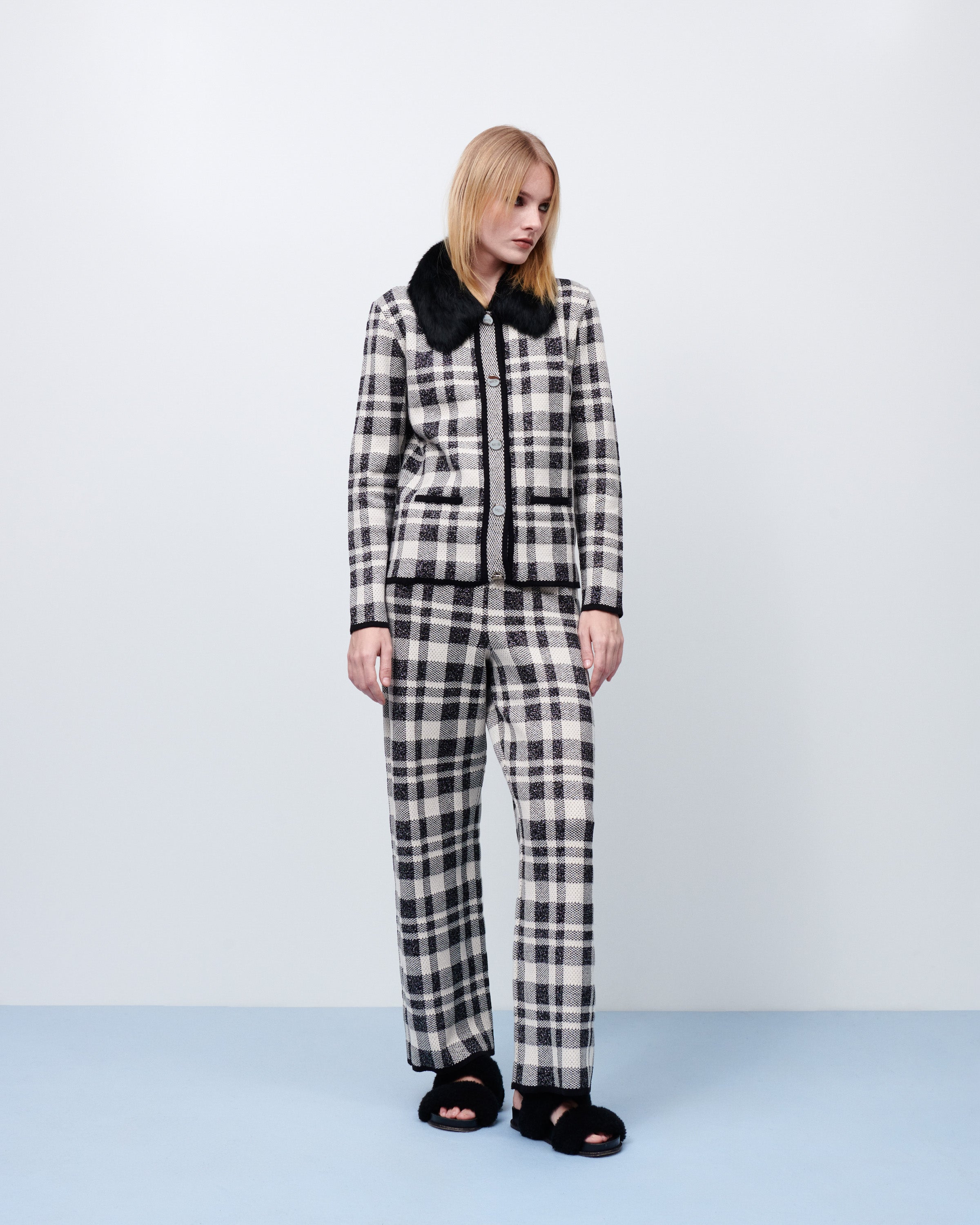 Calça tricot jacquard xadrez baunilha