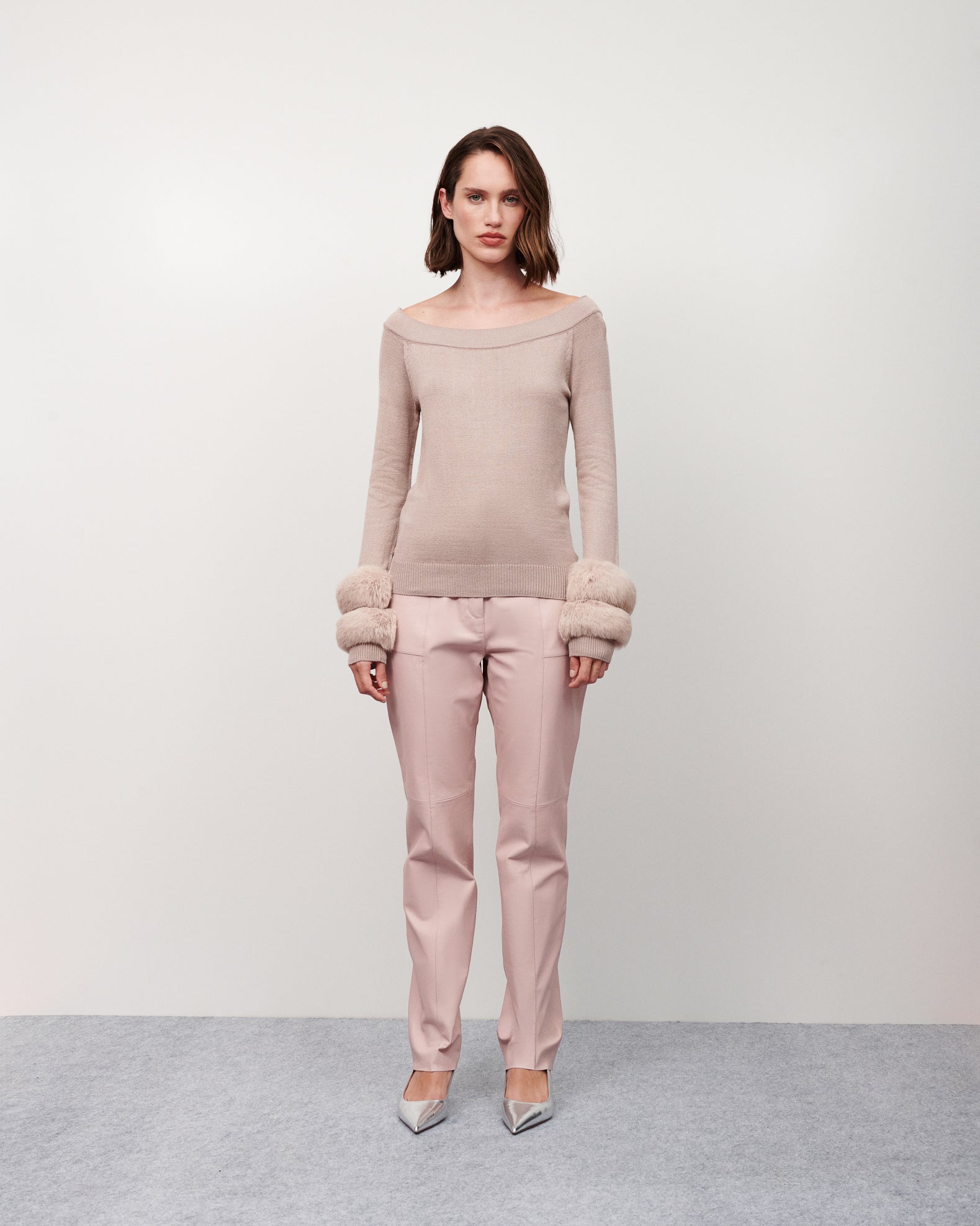 Blusa tricot ombro a ombro punho pele rosé