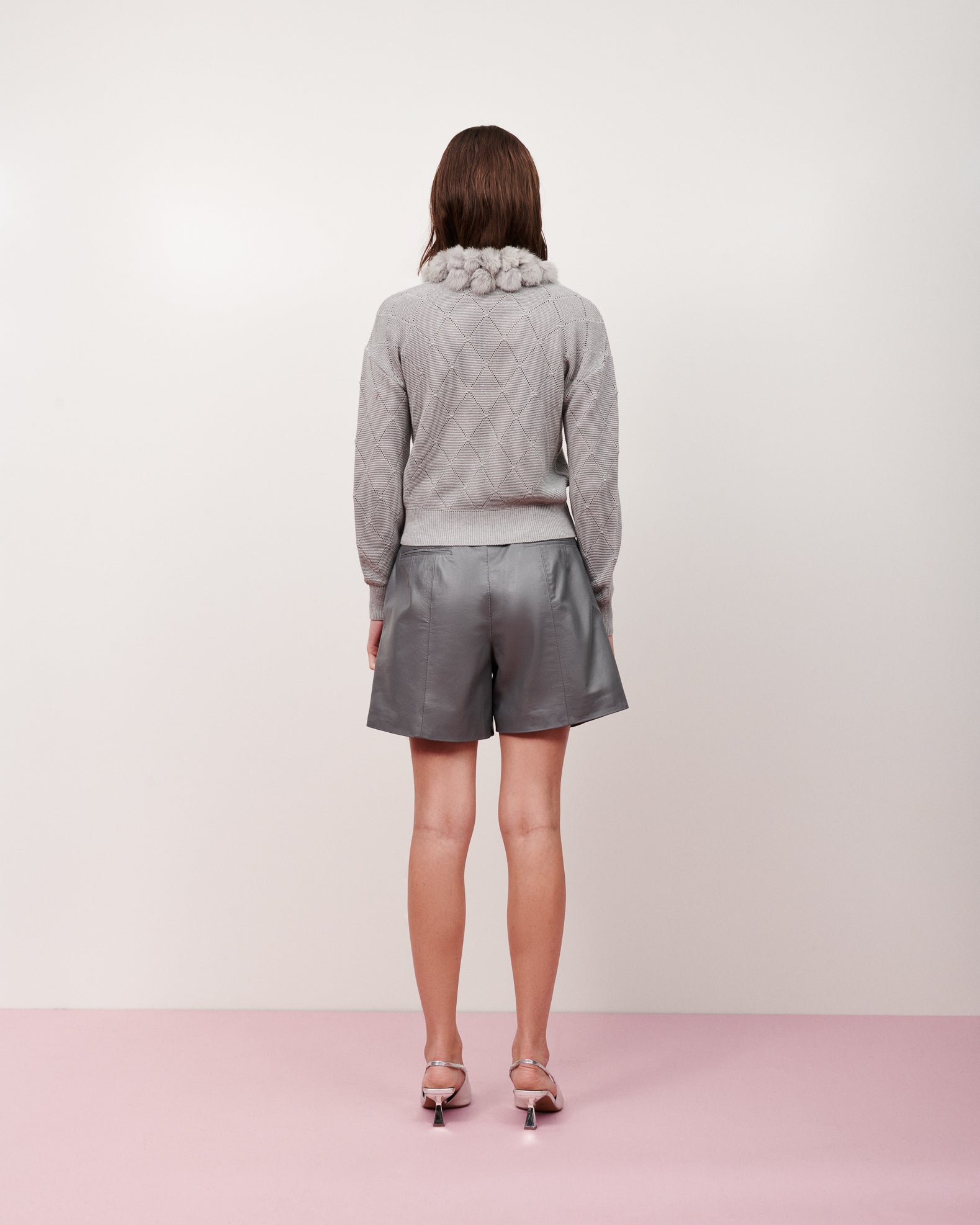 Blusa tricot losangos gola pompom cinza