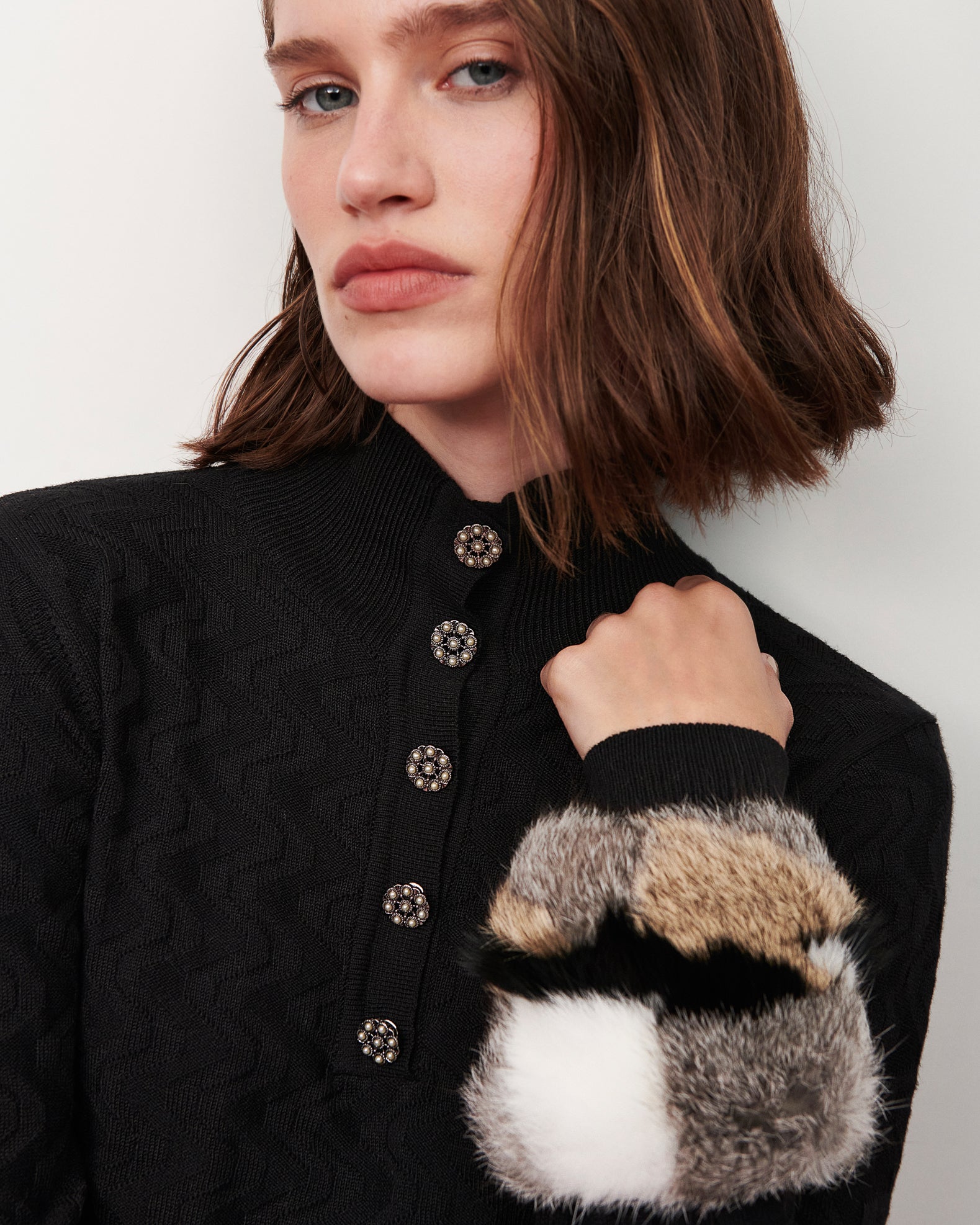 Blusa tricot gola roule botões punho pele preto