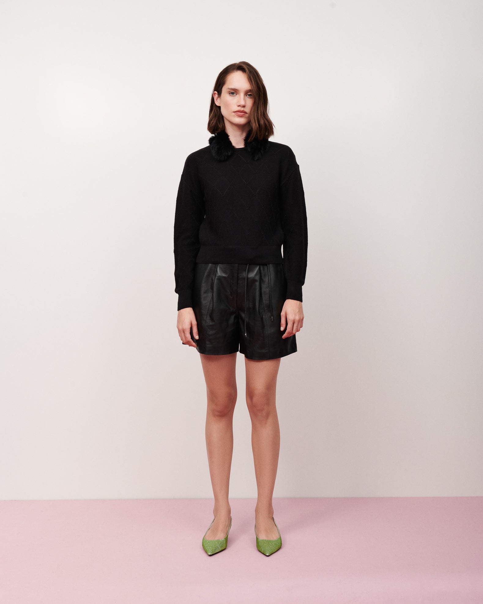 Blusa tricot losangos gola pompom preto