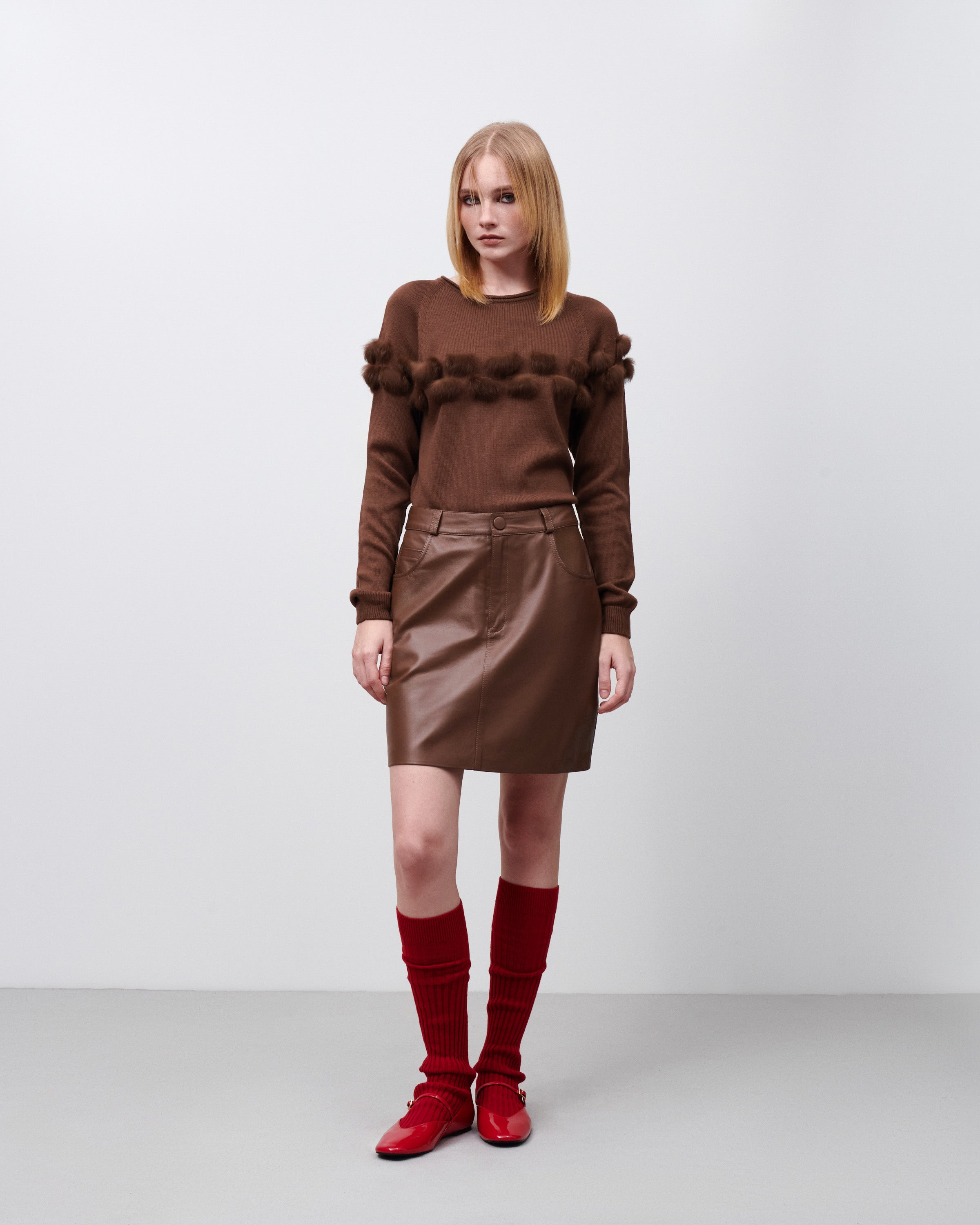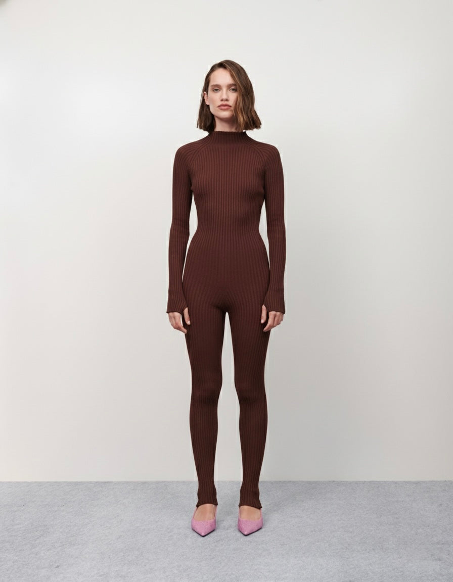 Blusa tricot manga longa fita pele marrom