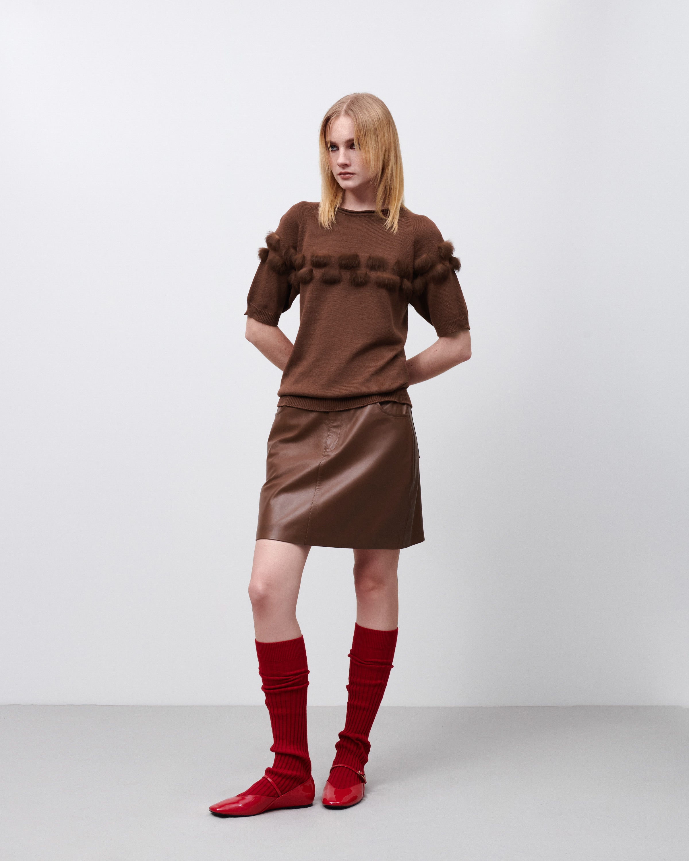 Blusa tricot manga curta fita pele marrom