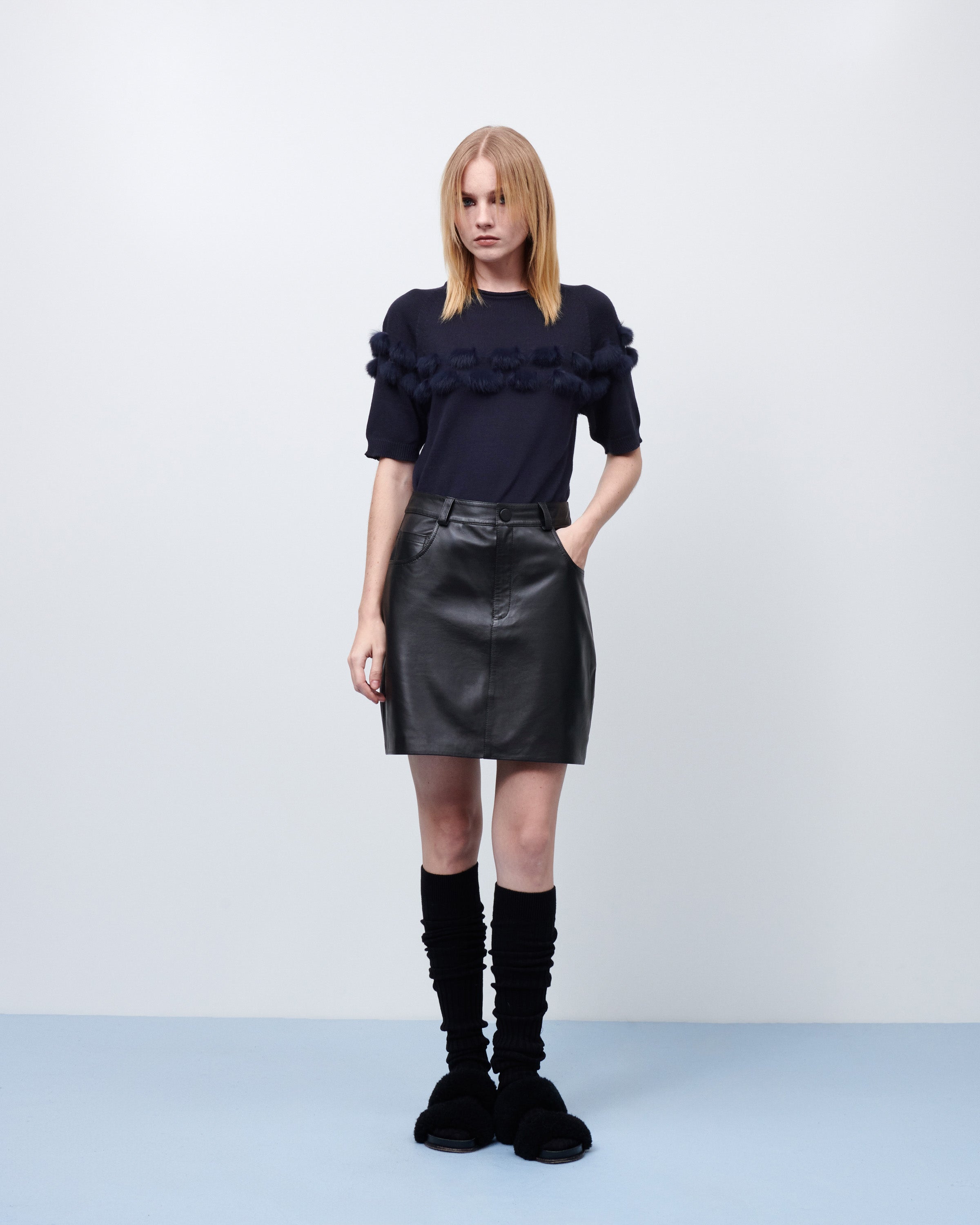 Blusa tricot manga curta fita pele marinho