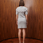 O tricot ganha leveza e ousadia na versão com mangas curtas e aplicação de fita de pele — um bordado artesanal que contorna o busto com textura e movimento, criando um efeito gráfico inesperado. Confeccionado em fio misto de algodão, combina sofisticação e conforto em uma silhueta fácil de usar, perfeita para produções elegantes e descomplicadas. Um clássico MES com espírito jovem e olhar contemporâneo.