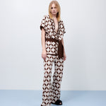 Calça em tricot com padronagem geométrica desenvolvida em jacquard, que alia conforto e impacto visual. Com modelagem reta e cintura média, valoriza a silhueta com leveza e movimento. O caimento estruturado acompanha o corpo sem marcar, enquanto o desenho gráfico em tons terrosos traz sofisticação e originalidade. Ideal para compor conjuntos com o colete coordenado, mas também se destaca sozinha em produções mais criativas e modernas.