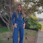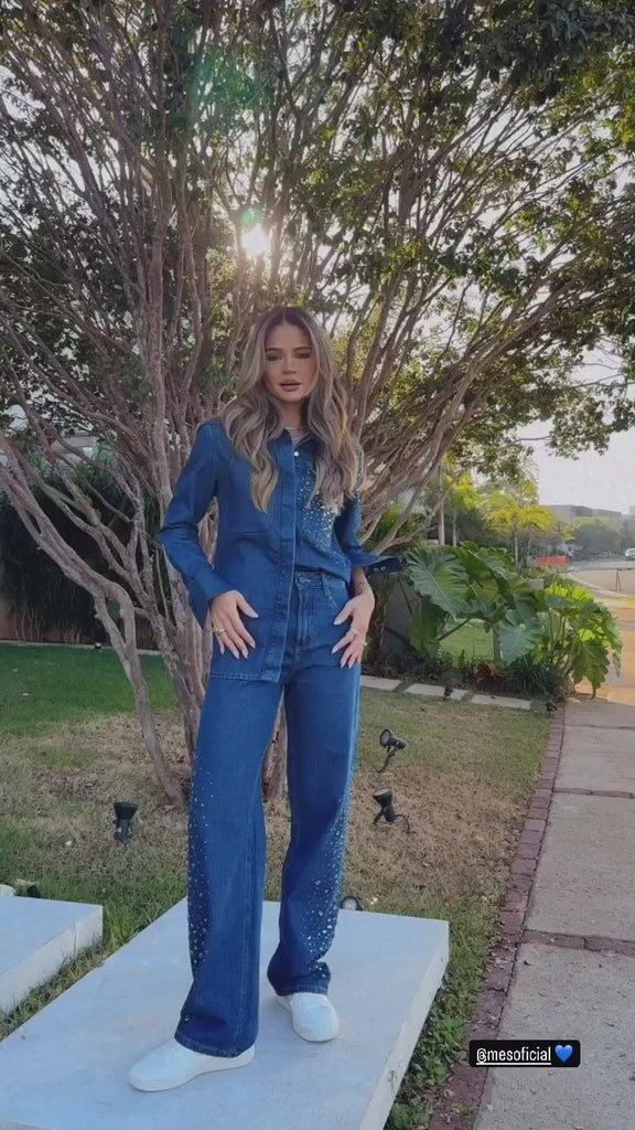 Camisa confeccionada em jeans, possui aplicação de cristais, botões no centro frente, punhos em couro com botões, dois bolsos frontais, sendo um deles de couro.