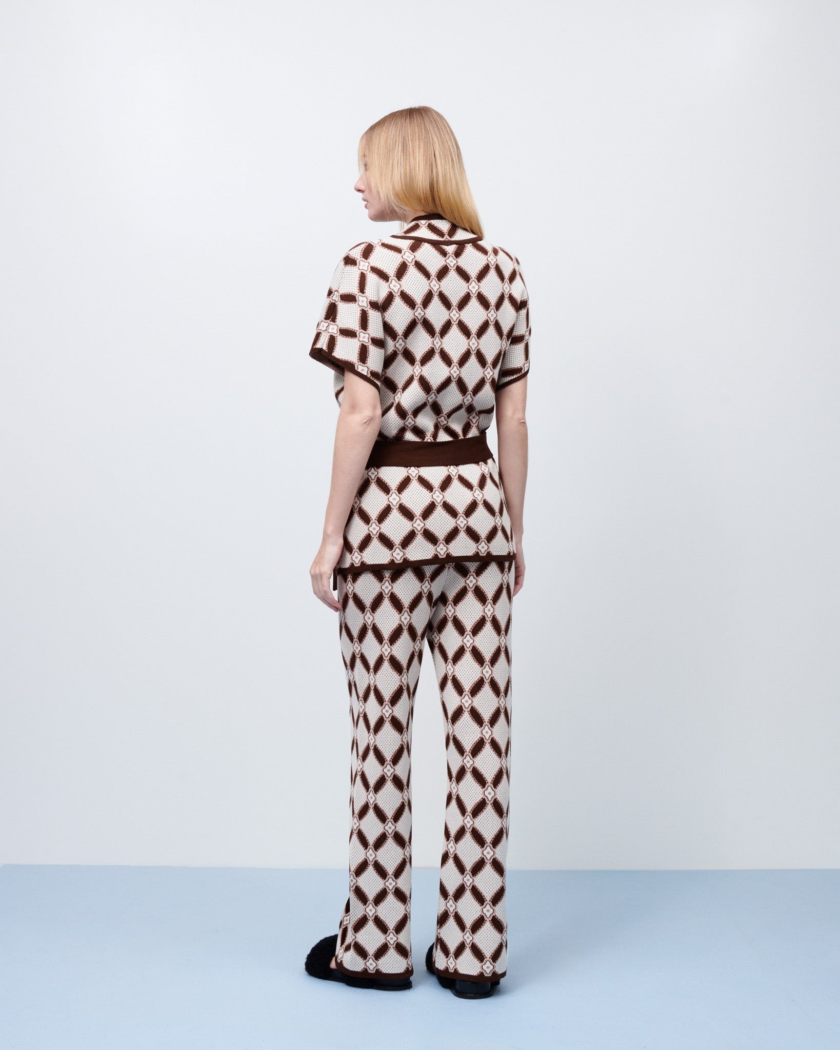 Com apelo gráfico e sofisticação artesanal, este colete em jacquard de tricot é uma peça-chave da coleção. Sua padronagem geométrica cria um jogo visual de profundidade e textura, conferindo personalidade instantânea ao look. O comprimento alongado traz leveza e movimento, equilibrando estrutura e fluidez com maestria. A faixa de tricot no mesmo tom cria a possibilidade de ajuste na cintura, valorizando a silhueta de forma sutil e elegante. A gola ampla e as mangas curtas complementam a proposta com um toque despojado, que transita facilmente entre o urbano e o resortwear. Uma peça versátil e expressiva, pensada para mulheres de espírito contemporâneo.