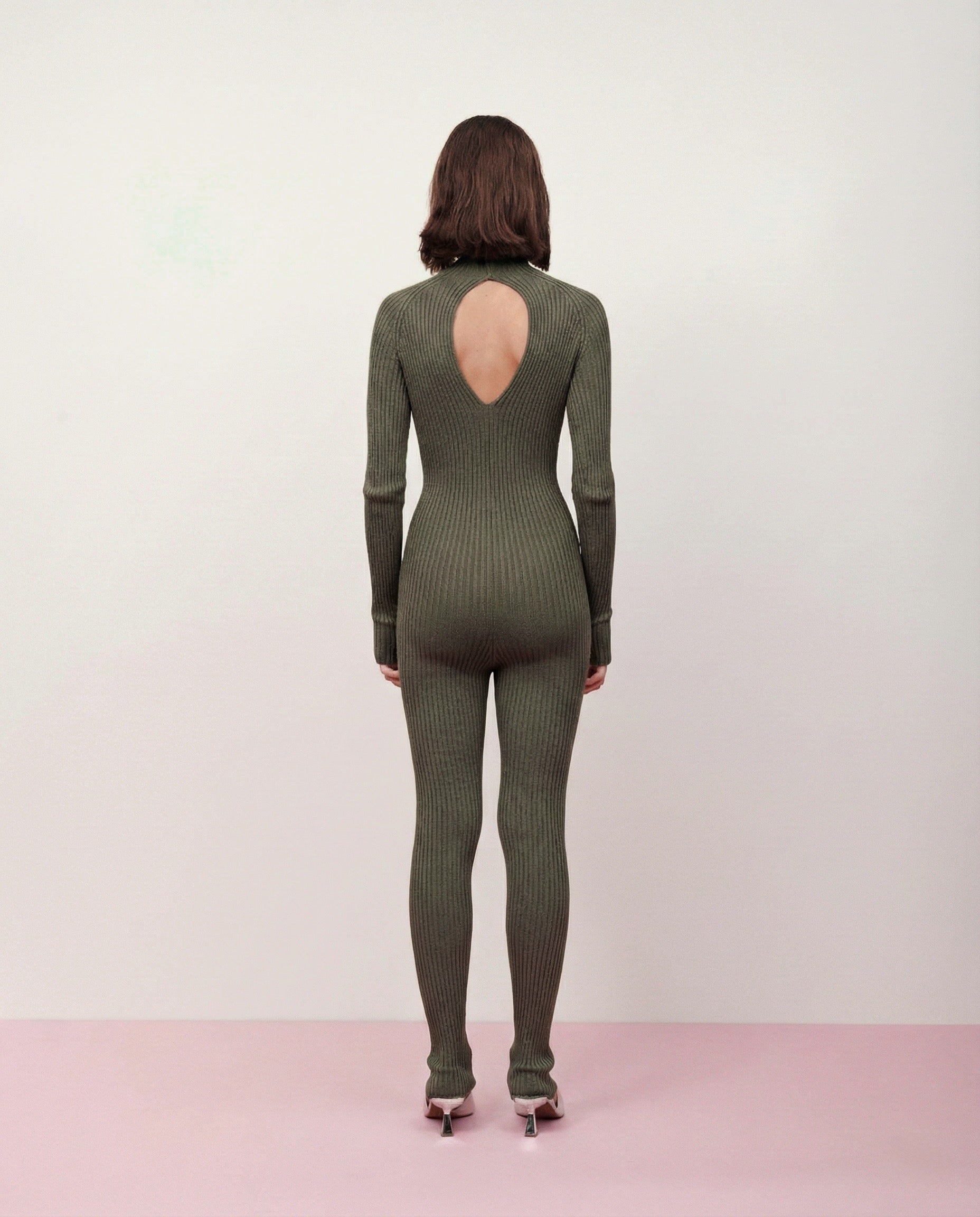 O macacão canelado é versátil e elegante. Ideal para criar sobreposições com casacos volumosos, a peça-desejo da temporada tem um charmoso decote redondo nas costas e gola chaminé. Sexy e elegante na medida certa.