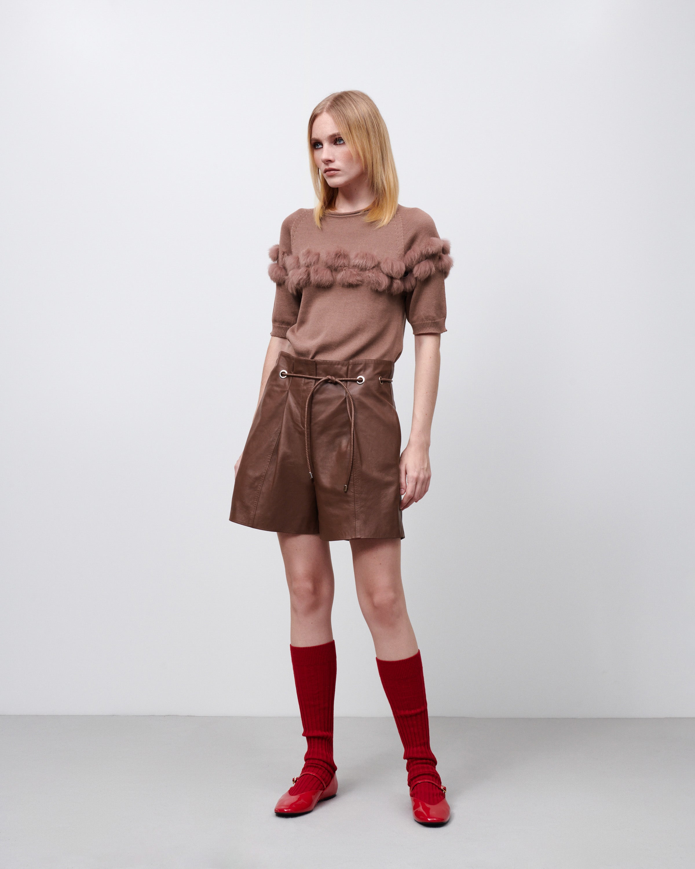 Blusa tricot manga curta fita pele mocha