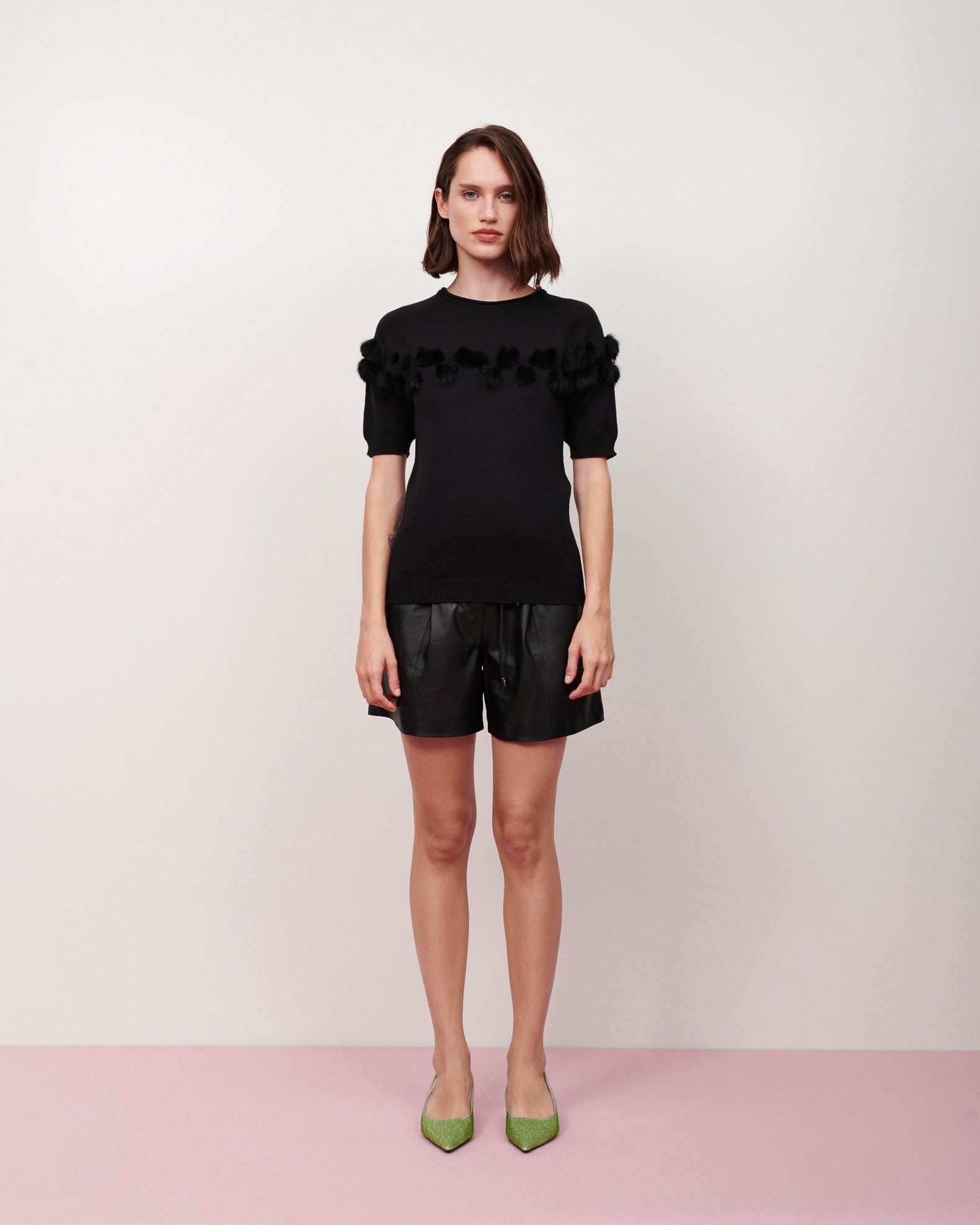 Blusa tricot manga curta fita pele preto