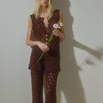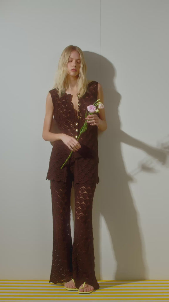 Colete longo em renda de tricot, com visual artesanal e sofisticado. Confeccionado com fio de viscose e poliamida, o modelo tem textura leve, toque agradável e desenho vazado com padronagem geométrica. A peça possui fechamento frontal com botões personalizados e barra com leve ondulação que acompanha o ritmo do ponto. Com comprimento alongado e modelagem levemente ajustada, pode ser usado sozinho ou sobreposto a camisas e blusas para um styling elegante e contemporâneo.