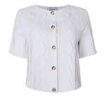 O fechamento frontal em botões dourados adiciona um toque sutil de brilho e acabamento refinado. Eles repetem o desenho das esferas aplicadas, criando continuidade no design. Com mangas curtas e gola careca, o casaqueto mantém um ar atemporal, ideal para compor produções que transitam entre o moderno e o clássico.