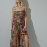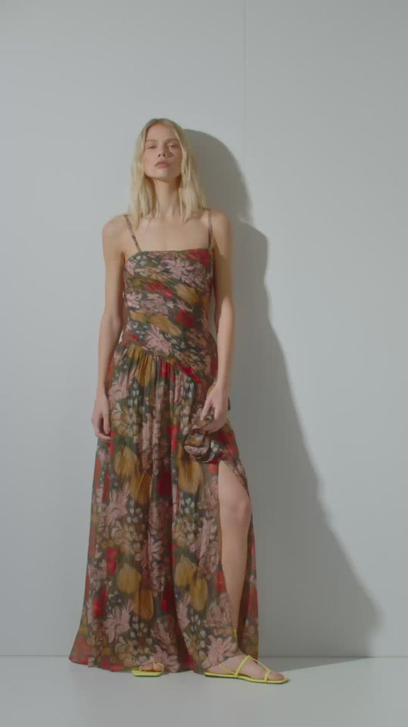 Com presença cênica e caimento leve, o vestido longo estampado Éden traduz o espírito da coleção Jardin de Nuit em sua forma mais ousada e encantadora.