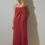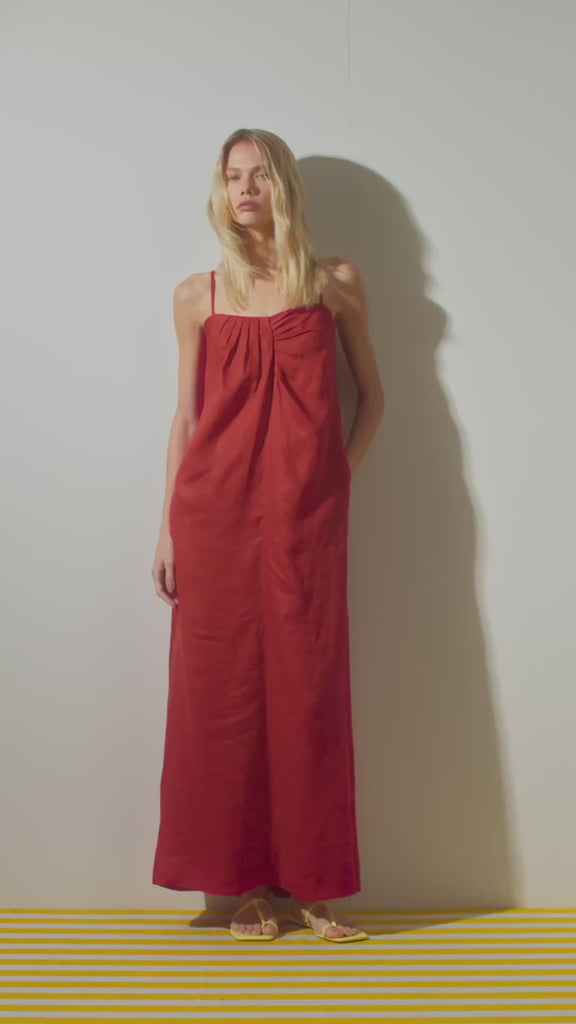 Vestido midi em linho com decote coração e pregas frontais que criam volume sutil e movimento elegante. A fluidez da modelagem e o toque natural do tecido revelam o equilíbrio entre leveza e sofisticação. Em tom cherry, é uma peça perfeita para ocasiões que pedem presença e delicadeza.