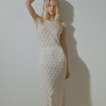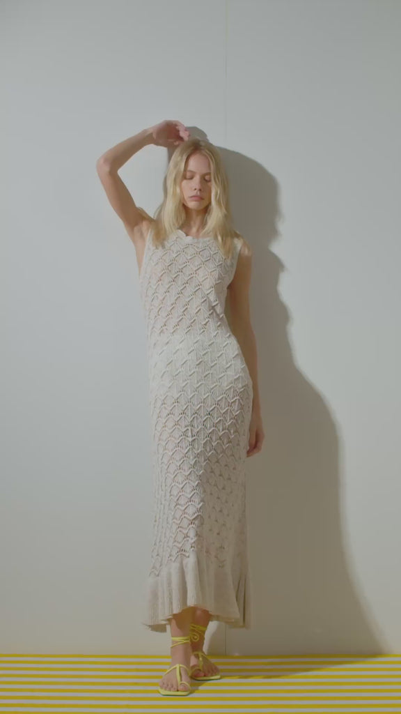 Vestido longo confeccionado em renda de tricô com desenho geométrico e textura artesanal. A trama revela um trabalho minucioso e leve, valorizado pelo mix de fios de viscose e poliamida, que confere fluidez, transparência sutil e toque macio à peça.