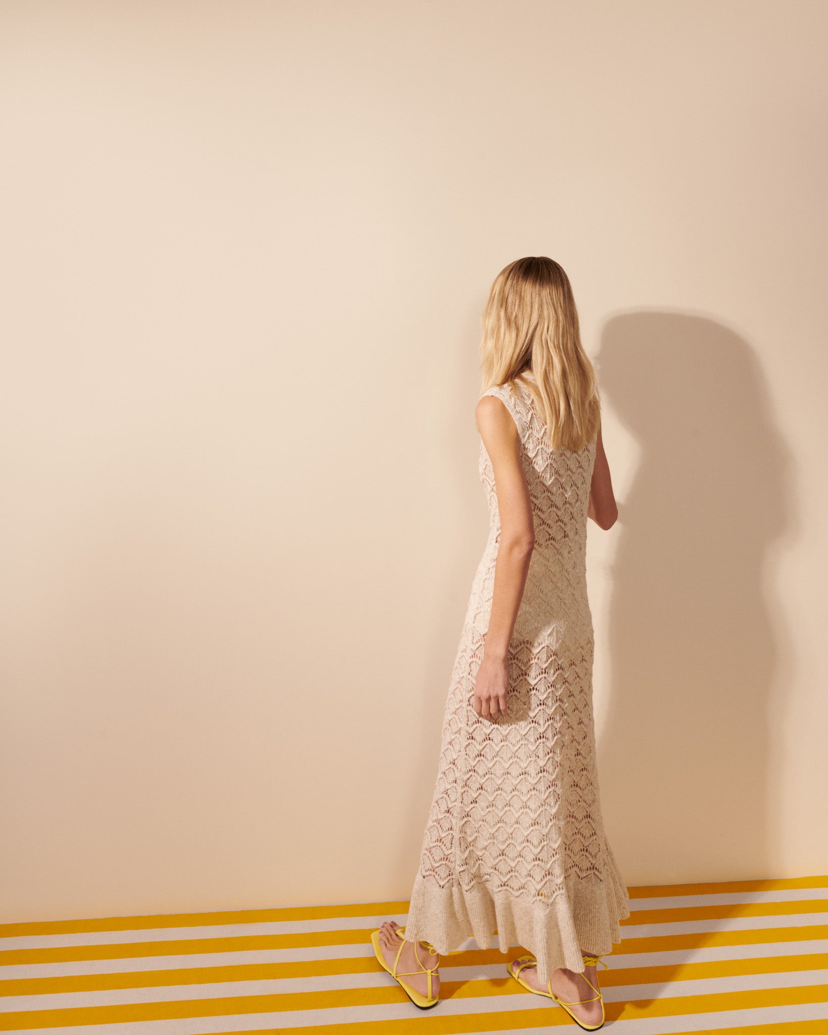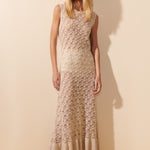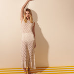 Vestido longo confeccionado em renda de tricô com desenho geométrico e textura artesanal. A trama revela um trabalho minucioso e leve, valorizado pelo mix de fios de viscose e poliamida, que confere fluidez, transparência sutil e toque macio à peça.