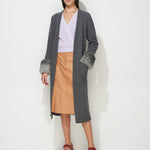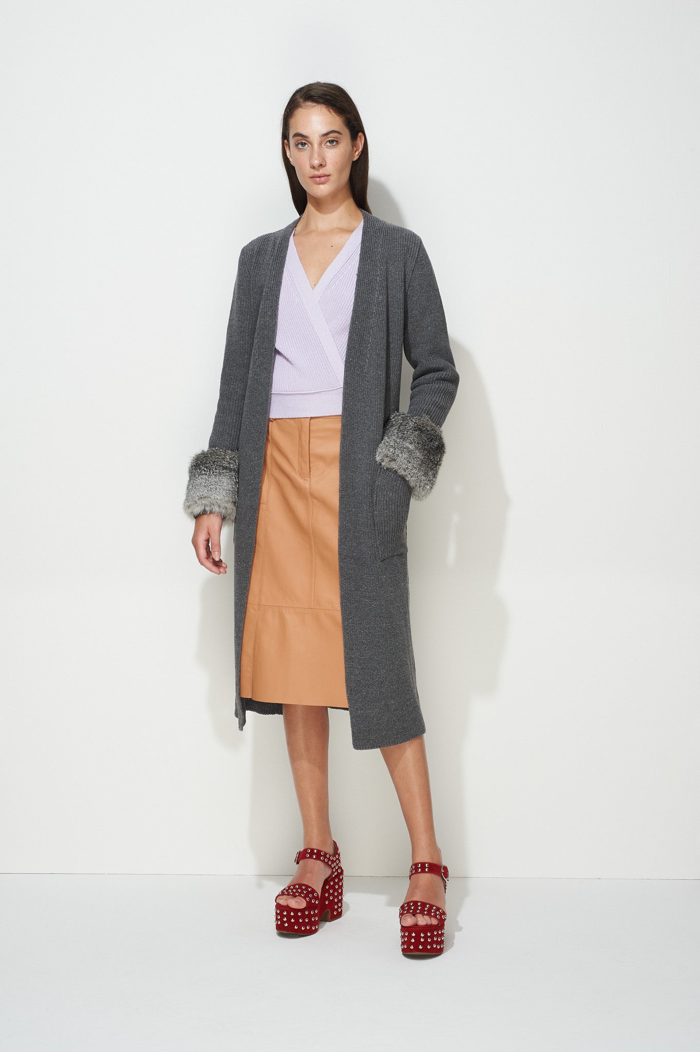 Cardigan longo em tricot de caimento estruturado, modelagem reta e textura encorpada. O detalhe de pele removível nos punhos adiciona sofisticação e um toque de contraste tátil. A peça acompanha faixa no mesmo fio para possibilitar amarração na cintura e versatilidade de uso — acinturado ou solto. Possui bolsos frontais aplicados, que equilibram funcionalidade e conforto. Ideal para sobreposições modernas.