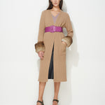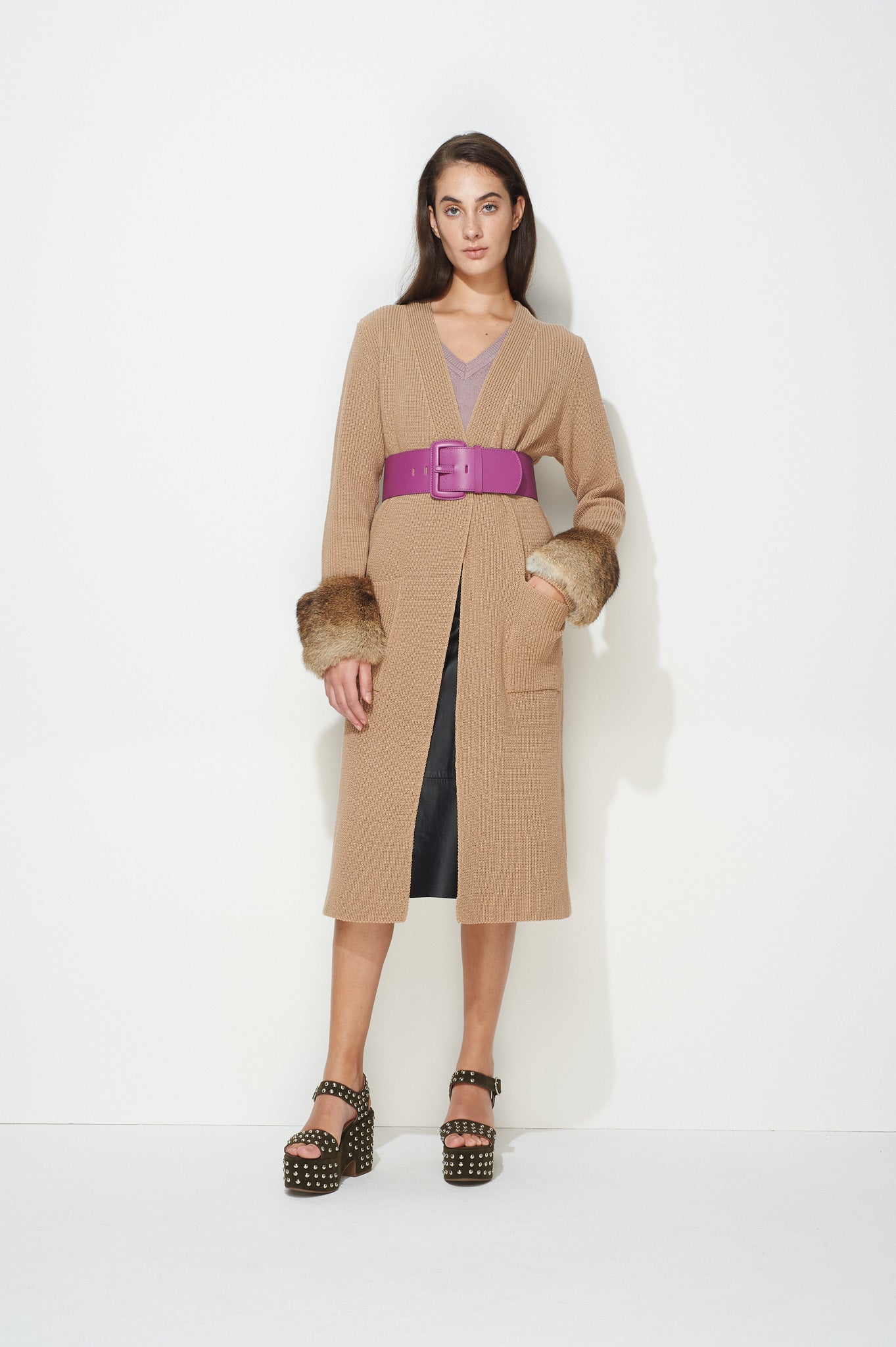 Cardigan longo em tricot de caimento estruturado, modelagem reta e textura encorpada. O detalhe de pele removível nos punhos adiciona sofisticação e um toque de contraste tátil. A peça acompanha faixa no mesmo fio para possibilitar amarração na cintura e versatilidade de uso — acinturado ou solto. Possui bolsos frontais aplicados, que equilibram funcionalidade e conforto. Ideal para sobreposições modernas.