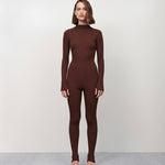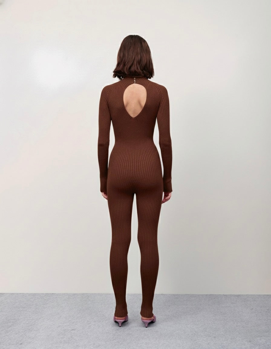 O macacão canelado é versátil e elegante. Ideal para criar sobreposições com casacos volumosos, a peça-desejo da temporada tem um charmoso decote redondo nas costas e gola chaminé. Sexy e elegante na medida certa.